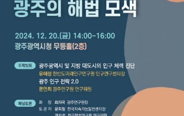 청년인구 유출과 저출생 가속화 등 인구 감소 위기 속에서 광주의 인구문제를 진단하고 해법을 모색하는 장이 마련된다.광주광역시(시장 강기정)는 광주연구원과 함께 20일 오후 2시 시청 무등홀에서 ‘2024년 광주시 인구정책 포럼’을 개최한다.이번 포럼의 주제는 ‘인구위기