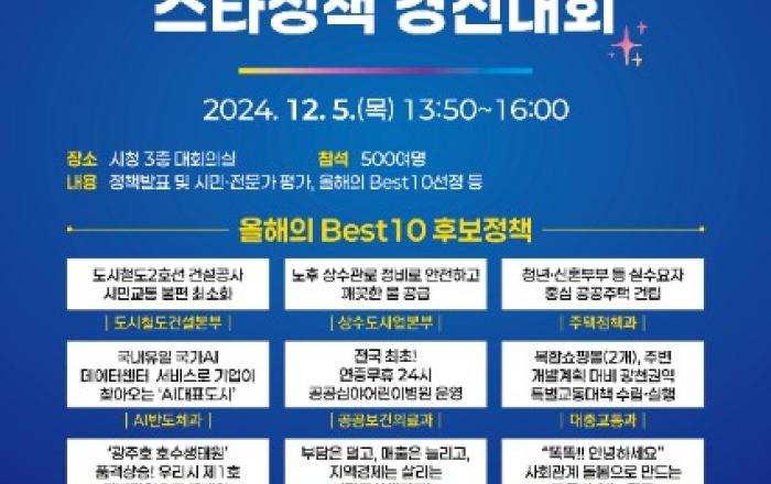 올해 광주시의 ‘베스트10 정책’은 뭘까? 광주시민들이 광주를 빛낸 우수정책들을 직접 뽑는다.광주광역시(시장 강기정)는 오는 5일 시청 대회의실에서 ‘2024년 광주를 빛낸 스타정책 경진대회’를 개최한다.올해 두 번째로 여는 ‘스타정책 경진대회’는 기존 우수정책 평가의