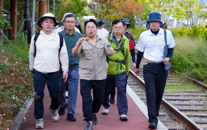 ▲강기정 광주광역시장이 28일 도시철도 2호선 1단계 구간과 연계한 대·자·보(대중교통·자전거·보행 중심) 도시 실현을 위해 박필순·최지현 광주시의회 의원, 시민단체, 관계공무원 등과 남구 푸른길공원 일대 현장답사를 벌이고 있다.강기정 광주광역시장은 28일 대·자·보(