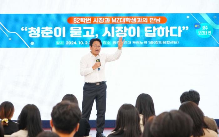 MZ 대학생들이 82학번 강기정 시장을 만나 허심탄회하게 고민을 털어놨다. 강기정 광주광역시장은 2일 광주보건대학교를 찾아 ‘청춘이 묻고 시장이 답하다’를 주제로 대학생들을 만났다. 이번 대화는 강 시장이 대학생 청년들과 눈맞춤 소통을 통해 학생들의 꿈을 응원하고, 다