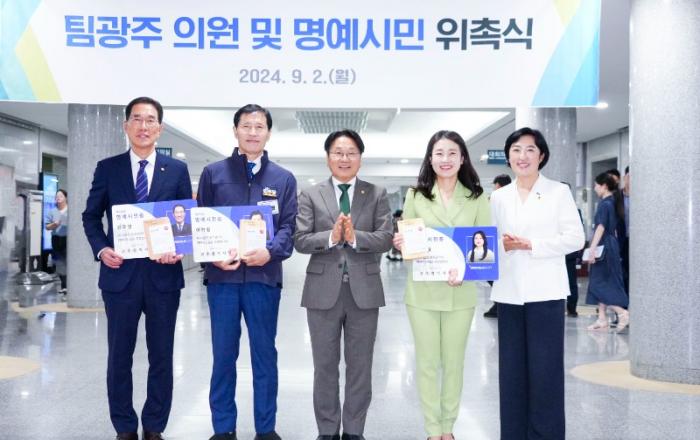 ▲강기정 광주광역시장이 2일 오전 서울 국회의원회관에서 열린 ‘광주의 날’ 개막식에서 환경노동위원회 소속 이학영 국회 부의장과 김주영·김소희 의원에게 팀광주 위촉패와 광주명예시민증을 수여하고 있다. 왼쪽부터 더불어민주당 김주영·이학영 의원, 강기정 광주시장, 국민의힘