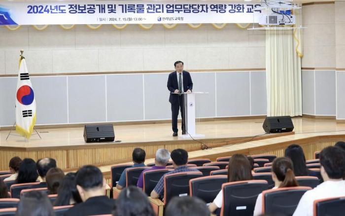 15일 전라남도교육청교육연구정보원에서 정보공개․기록물 관리 업무 역량 강화 교육이 진행되고 있다.전라남도교육청은 15일 전라남도교육청교육연구정보원에서 정보공개․기록물 관리 업무 역량 강화 교육을 실시했다.행정서비스 만족도 향상과 업무 역량을 높이기 위해 마련된 이번 교
