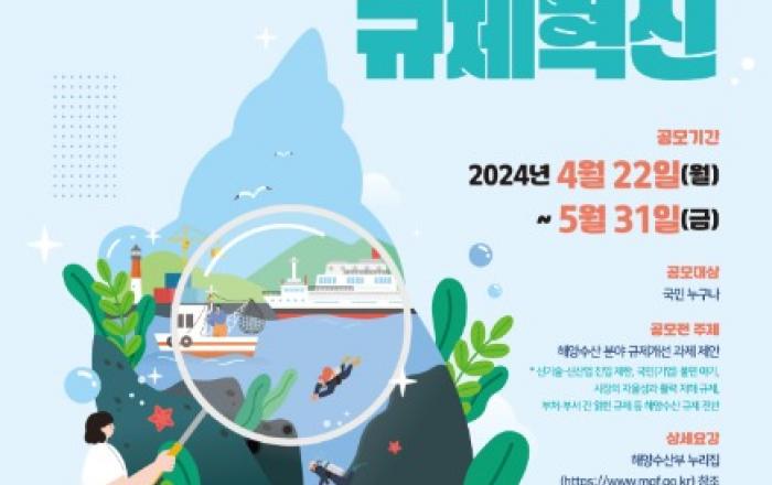 해양수산부(장관 강도형)는 4월 22일(월)부터 5월 31일(금)까지 40일간 해양수산 분야 규제혁신 과제를 발굴하기 위한 대국민 공모전을 개최한다. 해양수산부는 현장의 목소리를 반영한 소통‧체감형 규제혁신을 위해 2022년부터 매년 공모전을 개최하고 있으며, 올해로