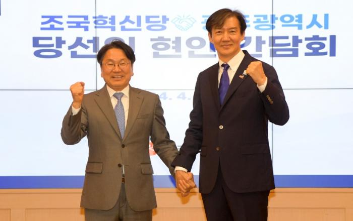 ▲ 강기정 광주광역시장이 23일 오전 시청 비즈니스룸에서 열린 ‘조국혁신당 당선인 현안간담회’에 참석해 조국 대표 등 참석자들과 함께 기념촬영을 한 후 주요 시정현안에 대한 지원을 요청하고 있다. /광주광역시 제공강기정 광주광역시장과 조국 조국혁신당 대표가 광주 발전을