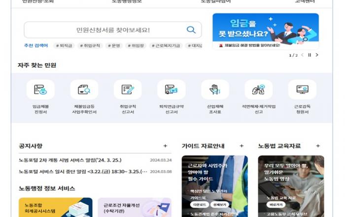 고용노동부는 지난해 5월 3일 개통한 노동포털 누리집(labor.moel.go.kr)에 산업안전 분야 민원 신청·조회 기능 등을 추가해 오는 30일부터 정식 서비스한다고 29일 밝혔다. 이에 따라 지난해 근로기준 분야 민원 61종에 이어 올해는 산업안전 분야 민원 38