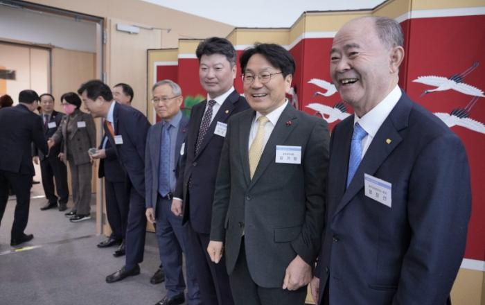 ▲ 강기정 광주광역시장(오른쪽 두번째)이 3일 오전 서구 김대중컨벤션센터에서 열린 ‘2024년 광주상공회의소 신년인사회’에서 기관장, 기업인 등 참석자들을 맞이하고 있다./광주광역시 제공“지역 경제인들의 신년 인사회에 광주시 모든 실국장들이 참석하였습니다. 경제 살리기