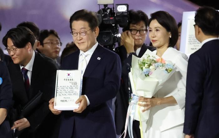 이재명 대통령은 15일 "대한민국 주권자의 충직한 일꾼으로서 오직 국민만 믿고 국민이 주인인 나라, 모두가 행복한 나라를 향해 성큼성큼 직진하겠다"고 밝혔다.이 대통령은 광복 80주년인 이날 서울 광화문 광장에서 열린 '국민임명식'에서 국민 대표단으로부터 국민 임명장을