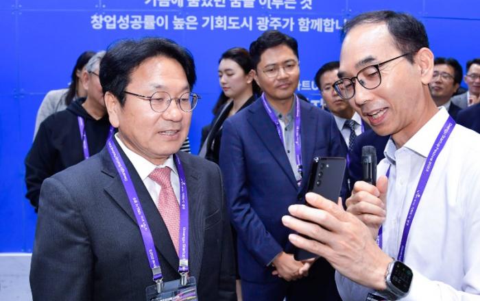 ▲ 강기정 광주광역시장이 2일 오후 서구 김대중컨벤션센터에서 열린 '2023 광주창업 페스티벌'에 참석해 내빈들과 전시장을 둘러보고 있다./광주광역시 제공광주시가 창업성공률이 높은 기회도시 광주 실현에 속도를 내고 있다.광주광역시(시장 강기정)는 지역의 창업문화를 확산