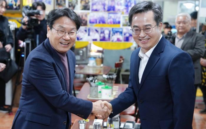▲ 강기정 광주광역시장과 김동연 경기도지사가 14일 오전 서구 양동시장 하나분식에서 조찬회동을 앞두고 악수를 하고 있다./광주광역시 제공강기정 광주광역시장은 14일 오전 서구 양동시장 한 국밥집에서 김동연 경기도지사와 조찬회동을 하고 지방경쟁력을 키우기 위한 메가시티