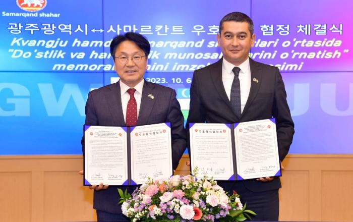 광주광역시(시장 강기정)와 실크로드의 중심지 우즈베키스탄 사마르칸트시가 6일 시청 비즈니스룸에서 우호협력 협정을 체결했다.2014년 일본 요코하마, 중국 취엔저우시와 우호협정 체결 이후 약 10년 만이다.지난해 베트남 응에안성과 자매결연 체결에 이어 우즈베키스탄 사마르