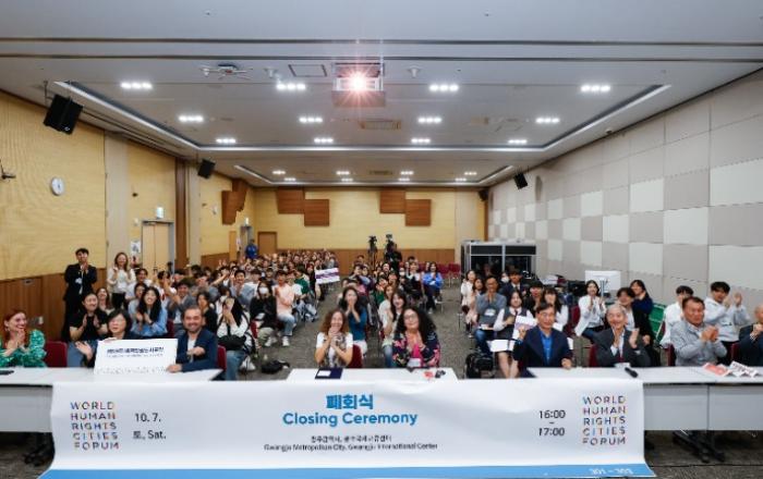 광주광역시(시장 강기정)는 인권 관련 국제기구, 국내외 도시대표, 인권 전문가와 시민 등 1500여명이 참여한 제13회 세계인권도시포럼이 7일 폐막했다.이날 김대중컨벤션센터에서 열린 폐회식에는 전체회의와 주제회의, 특별회의에서 논의 된 결과 보고와 포럼 선언문 낭독,