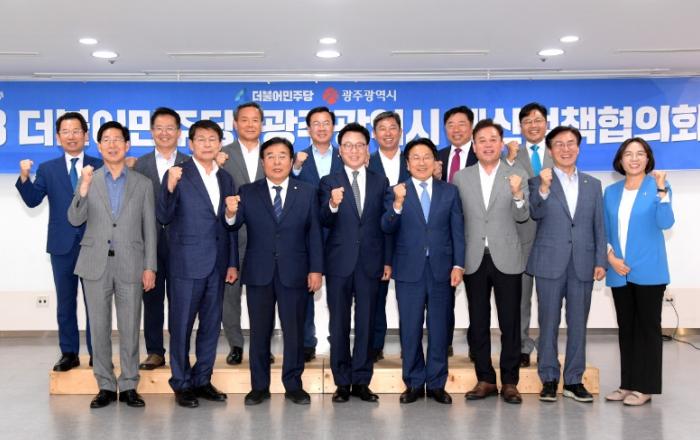 ▲강기정 광주광역시장이 11일 오후 시청 중회의실에서 열린 '더불어민주당 예산정책협의회'에 참석해 박광온 원내대표 등 참석 국회의원들과 함께 기념촬영을 하고 있다.광주광역시(시장 강기정)와 더불어민주당은 11일 오후 3시 시청 중회의실에서 ‘예산정책협의회’를 열어 내년