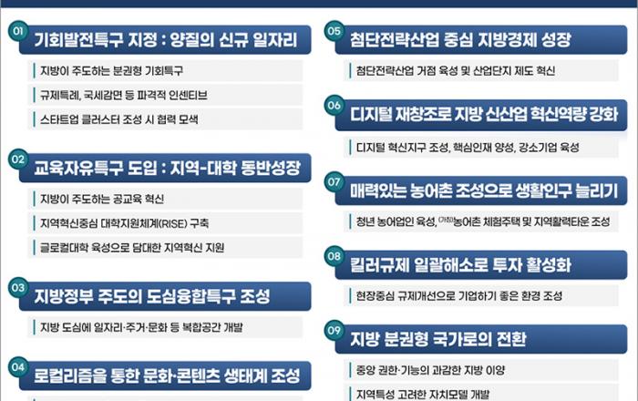 정부가 기회발전특구·교육자유특구·도심융합특구·문화특구 등 4대 특구를 도입해 본격적인 지방시대를 열고 지방의 새로운 기회를 창출하기로 했다. 기회발전특구는 파격적인 세제 혜택 등을 ‘당근’으로 수도권 기업을 유치하고, 교육자유특구는 경쟁력 있는 지방대 육성 등 지
