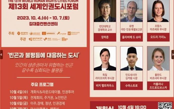 세계 인권 전문가들이 10월 광주로 모인다.광주광역시(시장 강기정)는 유엔 인권최고대표사무소, 유네스코, 국가인권위원회, 광주시교육청과 공동으로 오는 10월 4일부터 7일까지 김대중컨벤션센터에서 ‘제13회 세계 인권도시포럼’(이하 광주포럼)을 개최한다.올해 주제는 ‘빈