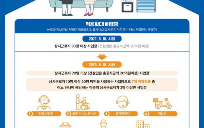 지난해 8월18일부터 50인 이상 사업장에 대해 휴게시설 설치가 의무화된 데 이어 오는 18일부터는 50인 미만 사업장까지 확대된다. 고용노동부는 소정의 기준에 따른 20인 이상 또는 10인 이상 사업장이 이번 적용 대상으로, 산업안전보건법에서 정한 기준에 따라 휴게시