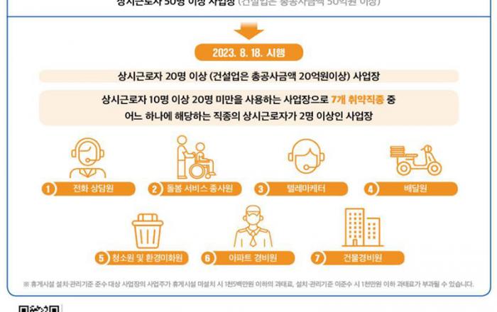 고용노동부는 8.16.(수) 10시, 6개 주요 업종별 협회와 8.18.부터 시행되는 50인 미만 사업장 휴게시설 설치 의무화에 따른 준비상황을 공유하고, 제도의 현장 안착방안을 논의했다. 고용노동부는 간담회에서 50인 미만 사업장에 대한 휴게시설 의무화 제도 시행
