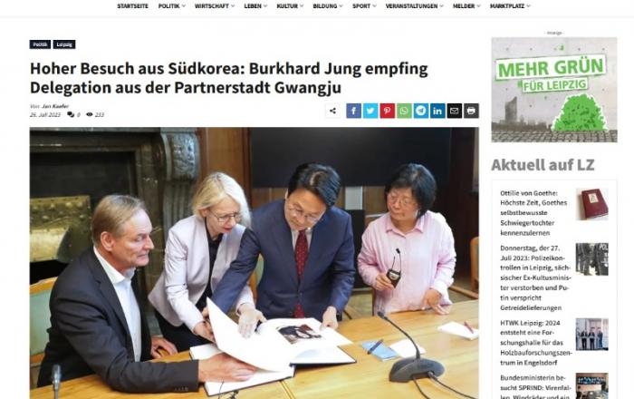 강기정 시장 등 광주광역시대표단의 독일 라이프치히 교류‧협력 활동을 현지 언론이 상세히 보도했다.라이프치히 지역언론인 ‘라이프치거 차이퉁(Leipziger Zeitung)’과 ‘작센TV(SACHSEN FERNSEHEN)’는 라이프치히 우호도시인 대한민국 광주광역시의 강