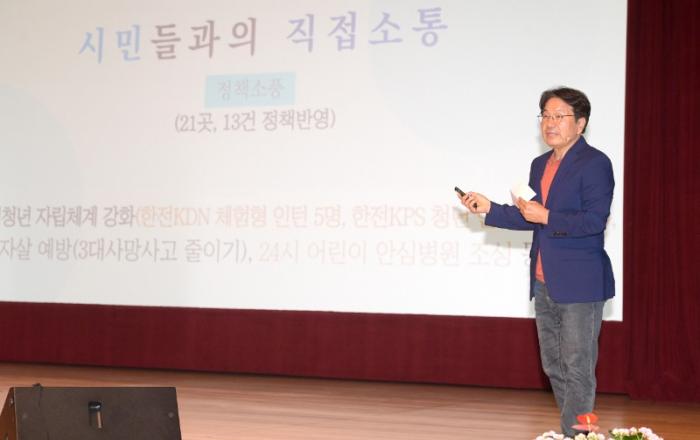 ▲강기정 광주광역시장이 4일 오전 시청 대회의실에서 열린 '7월 정례조회'에 참석해 '8760시간의 소회, 2만6280시간의 나아갈 길'이라는 주제로 민선8기 1년의 소회와 시정방향을 설명하고 있다./광주광역시 제공“시장은 소통을 통해 눈앞에서 이야기하는 시민뿐 아니라