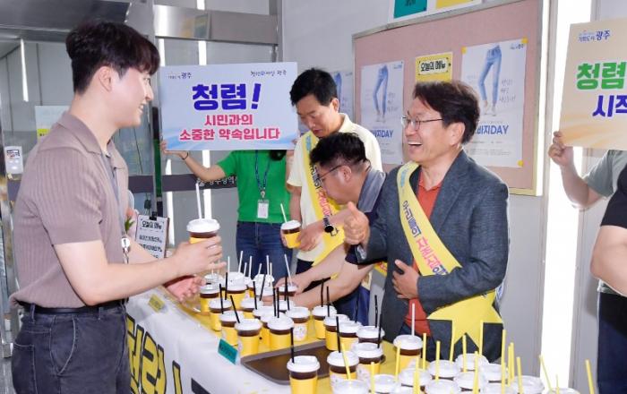 광주시가 ‘청바지데이’ ‘청렴 韓(광주) 잔 하세요’ 등 청렴실천캠페인을 잇따라 펼치며 청렴도 1등급 달성을 위한 조직문화 혁신에 나섰다. 광주광역시(시장 강기정)는 청렴하고 수평적인 조직문화 조성을 위해 4일 시청 구내식당에서 ‘청렴 韓(광주) 잔 하세요’라는 청렴실