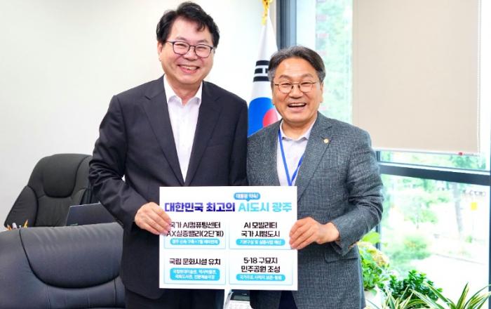 ▲ 강기정 광주광역시장이 7일 서울 국정기획위원회에서 이한주 국정기획위원장을 만나 국가 AI컴퓨팅센터 광주 구축, AX실증밸리 조성 등이 국정과제에 우선순위로 반영될 수 있도록 요청했다.강기정 광주광역시장이 국정기획위원회, 국방부, 국회 등을 오가며 광주발전 10대 프