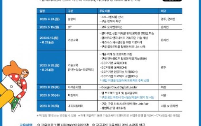 광주시와 구글 클라우드 코리아, 전남대학교가 인공지능(AI) 산업을 이끌어갈 ‘AI 융합인재 양성’에 힘을 모은다.광주광역시(시장 강기정)는 구글 클라우드 코리아, 전남대와 함께 운영하는 인공지능 교육프로그램인 ‘구글 클라우드 AI 캠프 for 전남대’의 5월 개강을
