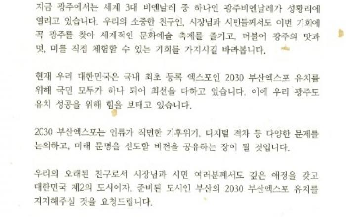 강기정 광주광역시장이 2030부산세계박람회 유치에 두팔을 걷어붙였다.광주시는 14일 제14회 광주비엔날레 파빌리온 프로젝트 참여 국가의 대사관과 문화원, 자매·우호 관계를 맺고 있는 14개국 23개 도시에 2030부산세계박람회 유치 지지를 요청하는 강기정 시장 명의 서
