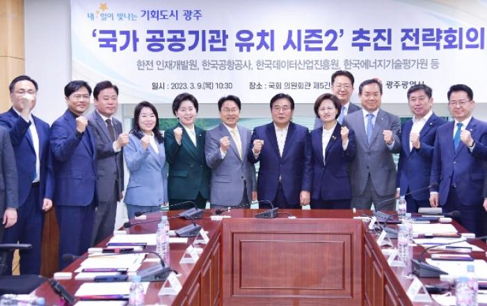 ▲ 강기정 광주광역시장이 9일 오전 서울 국회 의원회관에서 열린 '국가 공공기관 유치 시즌2 추진 전략회의'에 참석해 광주지역 국회의원 등과 기념촬영을 하고 있다. 앞줄 왼쪽부터 이디도 산업통상자원부 전략산업정책과장, 배일권 광주시 기획조정실장, 김광진 광주시 문화경제