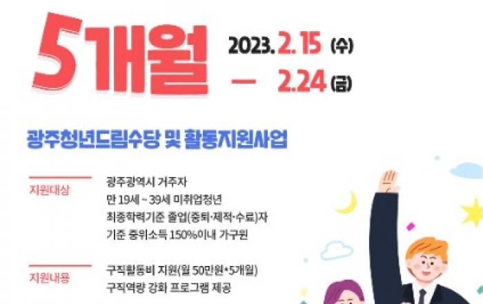 광주광역시(시장 강기정)는 올해 구직청년 1400명에게 매월 50만원씩 250만원을 지원한다.광주시는 미취업 청년의 구직활동에 필요한 경비를 지원하는 ‘광주청년드림수당 및 활동지원사업’으로 지난해 1200명보다 16.7% 늘어난 총 1400명에 게 1·2기로 나눠 지원