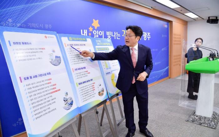 강기정 광주광역시장은 2일 오전 시청에서 새해 첫 정례조회를 겸한 시무식에서 “조직 활력을 통해 눈에 보이는 변화로 시민 행복을 이끌어가겠다”고 밝혔다.이날 행사에는 실·국장, 직원 등 600여 명이 참석한 가운데 4명의 직원 대표에게 질문을 받고 강 시장이 즉석에서