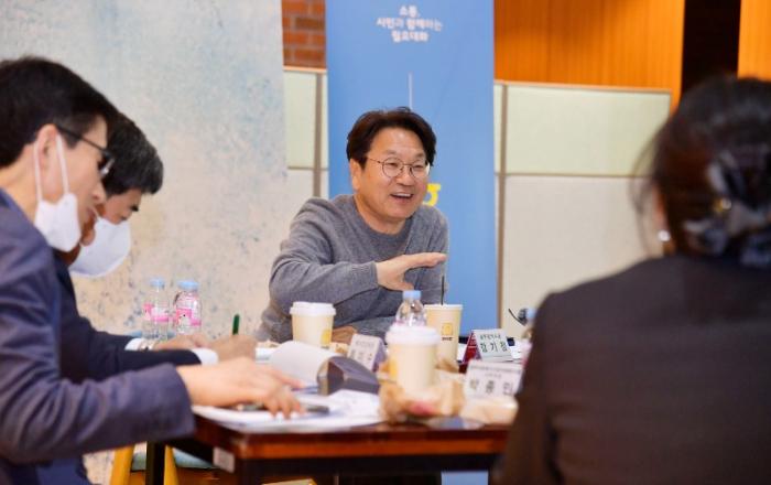 ▲ 강기정 광주광역시장이 지난 14일 오후 시청 다목적홀에서 열린 월요대화에 참석해 복지분야 전문가들과 광주다움 통합돌봄 체계 구축을 위한 논의를 하고 있다.강기정 광주광역시장은 “시민 누구나 플러스된 돌봄서비스를 누릴 수 있도록 기존 체계를 강화해 빈틈없는 통합돌봄을