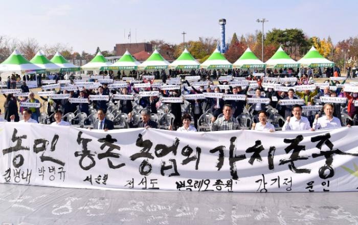 ▲ 강기정 광주광역시장이 11일 오전 서구 상무시민공원에서 열린 제27회 농업인의 날 행사에 참석해 광주시-자치구-농업인단체 간 농민수당 지원 협약을 체결한 뒤 기념촬영을 하고 있다./광주광역시 제공광주광역시는 2023년 농민수당 도입을 위한 추진 동력을 확보하고 속도
