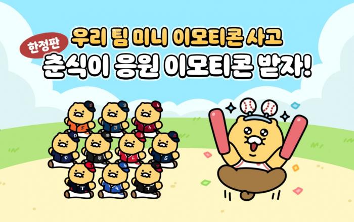 카카오가 춘식이 야구 이모티콘 패키지를 6월 10일부터 19일까지 기간 한정으로 출시한다.이번 패키지는 ‘미니 춘식이는 야구왕’, ‘춘식이는 야구팬’ 두 가지 이모티콘으로 구성됐다.‘미니 춘식이는 야구왕’은 KIA 타이거즈, 삼성라이온즈, LG트윈스, 두산베어스, kt