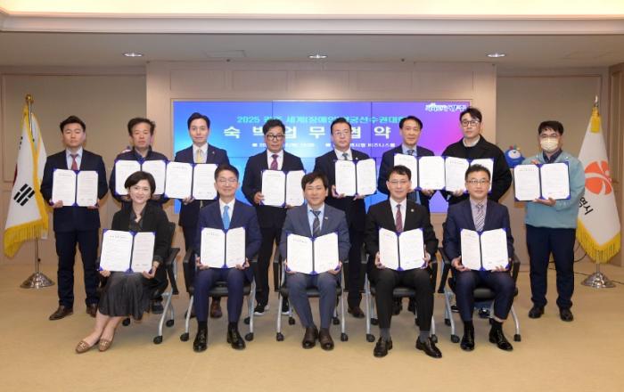 광주광역시(시장 강기정)는 16일 오후 시청 비즈니스룸에서 홀리데이인광주호텔, 라마다플라자광주호텔, 센트럴광주호텔&레지던스 등 광주지역 14개 호텔과 ‘2025 광주 세계(장애인)양궁선수권 대회의 성공 개최를 위한 숙박 업무협약’을 체결했다.이날 협약식에는 이상