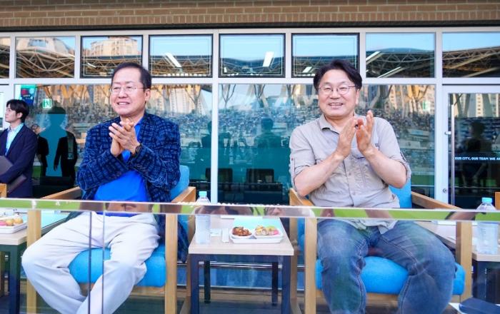 강기정 광주광역시장과 홍준표 대구광역시장이 이번엔 스포츠로 뭉쳤다. 강 시장과 홍 시장은 21일 저녁 대구시 DGB대구은행파크에서 열린 K리그 ‘광주FC-대구FC 축구 경기’를 관람했다. 양 시장은 경기 시작 전 그라운드에 올라 경기장을 찾은 관람객들에게 인사했다. 양
