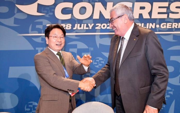 ▲28일(현지시간) 독일 베를린 타이타닉쇼세호텔에서 열린 '세계양궁연맹(WA) 총회'에 참석한 강기정 광주광역시장이 우구르 에르데너 세계양궁연맹 회장과 만나 반갑게 인사를 나누고 있다./광주광역시 제공“2025년 광주 세계양궁선수권대회는 전 세계 축제의 장으로, 세계인