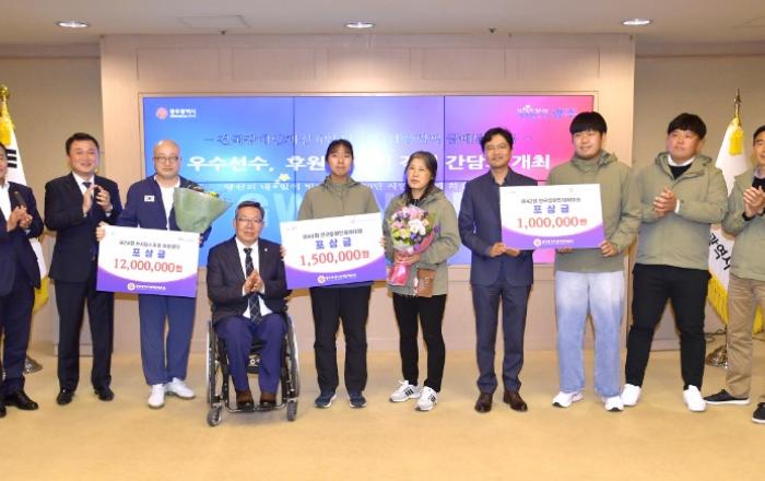 ▲ 김광진 광주광역시 문화경제부시장이 4일 오후 시청 비즈니스룸에서 열린 '전국장애인체육대회 6위 달성 및 데플림픽 금메달 획득 우수선수 후원 기업인 격려 간담회'에 참석해 선수단 포상금을 전달한 후 후원 기업인들과 함께 기념촬영을 하고 있다./광주광역시 제공광주광역시