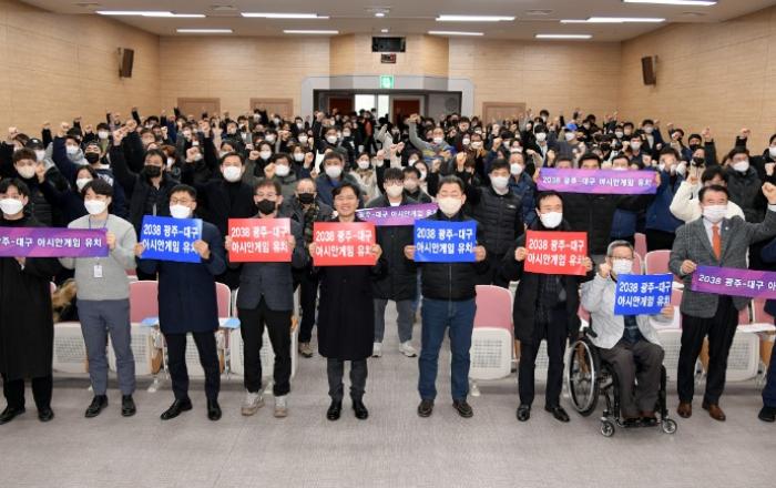 광주광역시(시장 강기정)는 26일 오후 2시 서구 올림픽기념국민생활관에서 ‘2038 하계 아시안게임 광주·대구 공동유치 대시민 보고회’를 개최했다.이날 보고회에는 김광진 광주시 문화경제부시장을 비롯해 시민단체‧체육 관계자, 시민 등 200여 명이 참석했다.보고회는 20