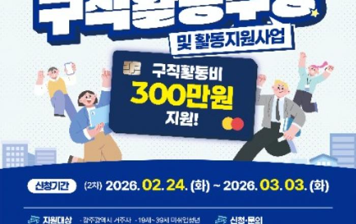 광주광역시(시장 강기정)는 미취업 청년의 안정적인 취업 준비를 지원하기 위해 ‘2026년 광주 청년 구직활동수당 지원’ 2차 참여자 1147명을 오는 3월3일까지 모집한다.‘청년 구직활동수당 지원사업’은 구직활동에 필요한 비용과 역량강화 프로그램을 함께 지원해 청년들의