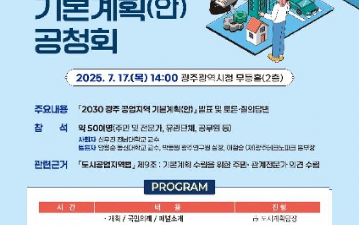 광주광역시(시장 강기정)는 17일 오후 2시 시청 2층 무등홀에서 ‘2030 광주광역시 공업지역 기본계획(안)’에 대한 공청회를 개최한다.이번 공청회는 공업지역의 체계적인 관리를 위한 정비 방향을 담은 계획(안)에 대해 시민과 전문가의 의견을 수렴하기 위해 마련됐다.광