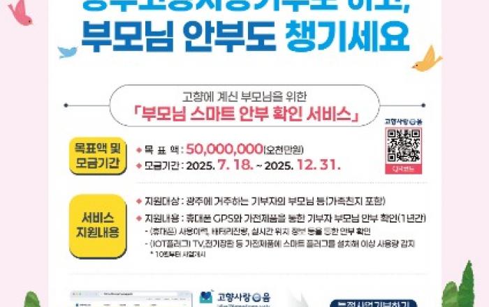 광주광역시(시장 강기정)는 고향사랑기부제를 활용해 시민이 체감하는 돌봄 복지 실현을 위해 2개의 지정 사업 모금에 나선다.고향사랑기부제 지정사업 모금은 기부자가 미리 정해진 자치단체의 사업 중에서 본인의 기부금이 사용되기를 원하는 사업에 직접 기부할 수 있는 제도이다.