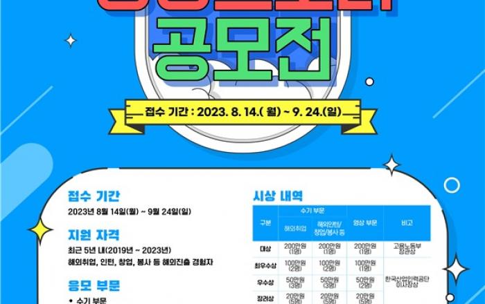 한국산업인력공단(이하 ‘공단’)은 ‘2023년 청년해외진출 성장스토리 공모전’을 9월 24일까지 개최한다. 공단은 2013년부터 매년 공모전을 개최해 해외에 진출하는 청년들의 노력과 성장을 응원하고 있다. 이를 통해 2013년부터 2022년까지 10년간 총 426명