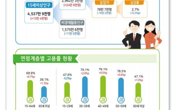 지난달 취업자수가 2개월 연속으로 35만명대를 유지했다. 고용률은 63.5%로 사상 최고를 기록했고, 실업률은 가장 낮았다. 통계청이 14일 발표한 ‘2023년 5월 고용동향’을 보면 지난달 취업자수는 2883만 5000명으로 1년전보다 35만1000명 증가했다.