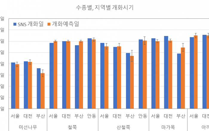 산림청 국립산림과학원이 지난 3월 발표했던 ‘봄철 꽃나무 개화시기 예측지도’의 예측일을 검증한 결과 개화시기 예측지도는 종별·지역별 개화시기의 차이가 확인되었으며, 예측 오차는 약 6일 내외인 것으로 나타났다. 봄철 꽃나무 개화시기
