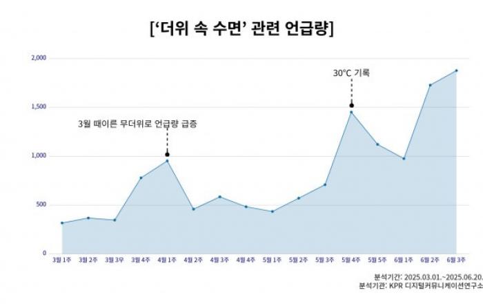 기후 변화로 여름철 고온 현상이 심화되면서 수면 환경을 개선하려는 소비자들의 수요가 빠르게 증가하고 있다.종합커뮤니케이션그룹 KPR 부설 KPR 디지털커뮤니케이션연구소가 3만 건의 소셜 빅데이터를 분석한 결과, ‘여름철 수면’과 관련된 키워드의 언급량이 3월 대비 5월