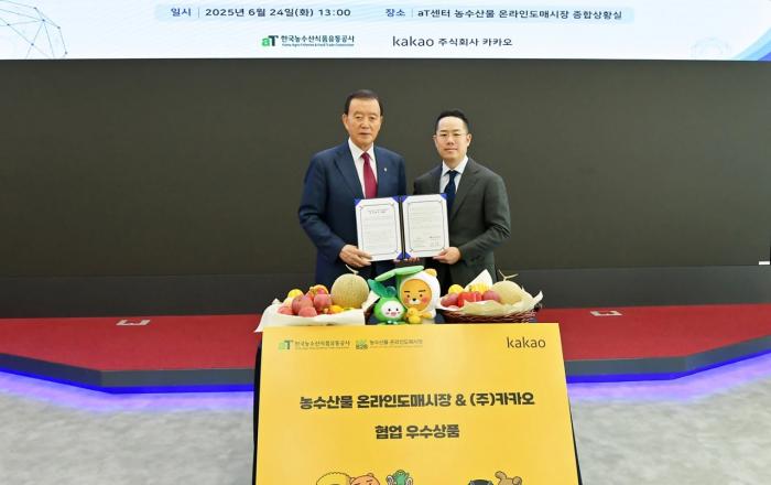카카오는 한국농수산식품유통공사(이하 aT)와 농수산물 온라인도매시장 거래 활성화를 위한 업무협약(MOU)을 6월 24일(화) 서울 양재동 aT센터에서 체결했다.이번 협약을 통해 양사는 디지털 전환 가속화와 농수산물 유통 구조의 효율화를 도모하고, 우수 농수산물 판로 확
