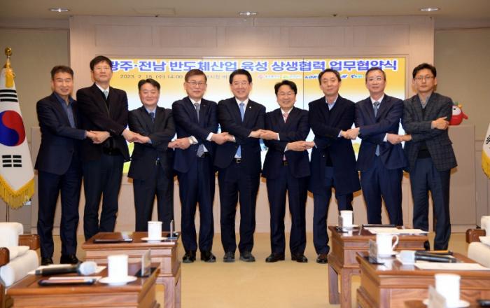 광주·전남 반도체특화단지 유치사업이 본격화되고 있다. 특히 우리나라를 대표하는 반도체 전문기관과 연구기관들이 반도체특화단지 광주‧전남 유치에 뜻을 뭉치면서 유치희망이 더욱 밝아졌다.광주광역시와 전라남도는 15일 광주시청 비즈니스룸에서 강기정 시장과 김영록 도지사 등이