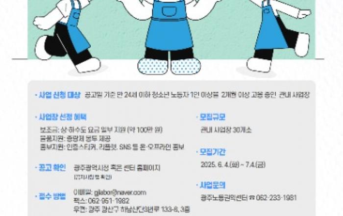 광주광역시(시장 강기정)는 청소년들의 안전하고 존중받는 아르바이트 환경 조성에 앞장서는 ‘2025년 청소년 알바 친화사업장’을 오는 7월4일까지 모집한다. ‘청소년 알바 친화사업장’은 24세 이하 청소년을 고용하는 광주지역 사업장 중 근로기준법 등 관련 법령을 준수하며