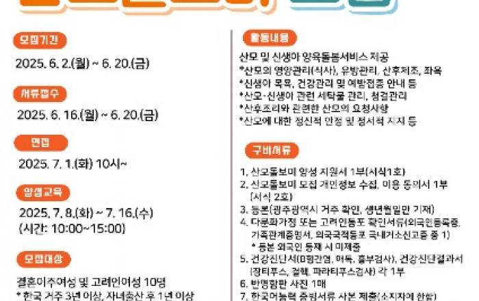 광주광역시(시장 강기정)는 다문화가정 산모와 신생아에게 양육 돌봄을 지원하기 위해 ‘2025년 다문화가정 산모돌보미’를 모집한다.모집대상은 ▲한국 거주 3년 이상 ▲자녀 출산 후 1년 이상 경과 ▲한국어능력시험(TOPIK) 3급 이상 또는 이에 준하는 의사소통능력을 갖