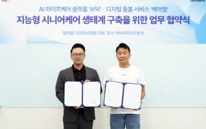 AI 기반 보험 플랫폼 ‘보닥’을 운영하는 코스닥 상장사 아이지넷(462980)과 시니어를 위한 디지털 라이프케어 서비스 ‘케어벨’을 운영하는 제로웹이 지난 11일 전략적 업무협약(MOU)을 체결했다. 이번 협약은 초고령 사회로 빠르게 진입 중인 한국 사회에서 디지털