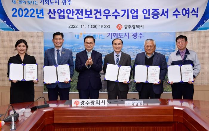 광주광역시는 1일 시청에서 ‘2022년 산업안전보건 우수기업’ 5곳에 대해 인증서와 현판을 수여했다.산업안전보건 우수기업 인증사업은 소규모 민간사업장의 산업안전에 대한 인식 강화와 안전한 노동환경 조성을 유도하고 산업재해 제로화 목표를 위해 올해 처음으로 공모를 실시했